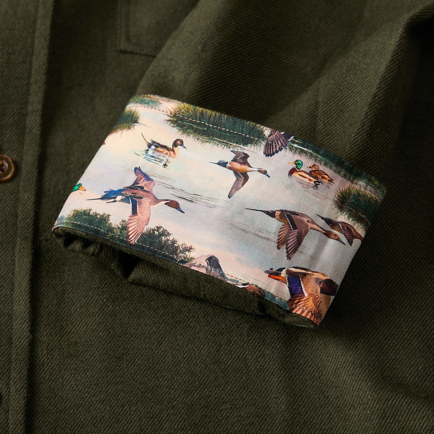 - Nature Print Liner: Mallard & pintail duck print under cuffs, collar and back yoke.